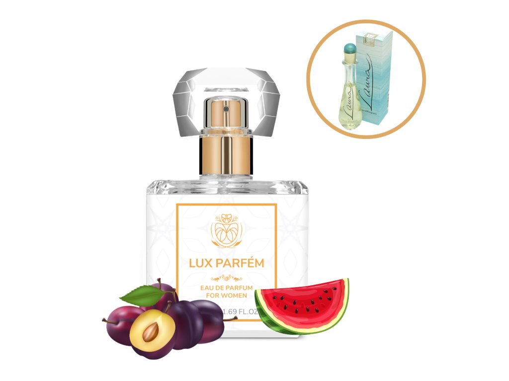 Náš parfém je inspirován květinovou vůní Laura. Vrchní tóny tvoří liči, švestka, zelené tóny, broskev, bergamot, vodní meloun a brazilské růžové dřevo, střední tóny jsou brambořík, fialka, frézie, jasmín, orchidej, lilie a růže a základ tvoří santalové dřevo, ambra a cedr.