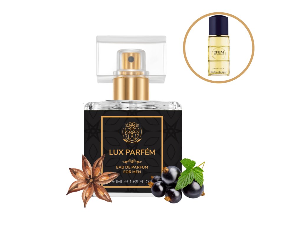 Náš parfém je inspirován orientálně - kořeněnou vůní Opium Pour Homme. Vrchní tóny jsou černý rybíz a badyán, střední tóny jsou galangal a pepř a základ tvoří tolu balzám, atlasový cedr a bourbonská vanilka.