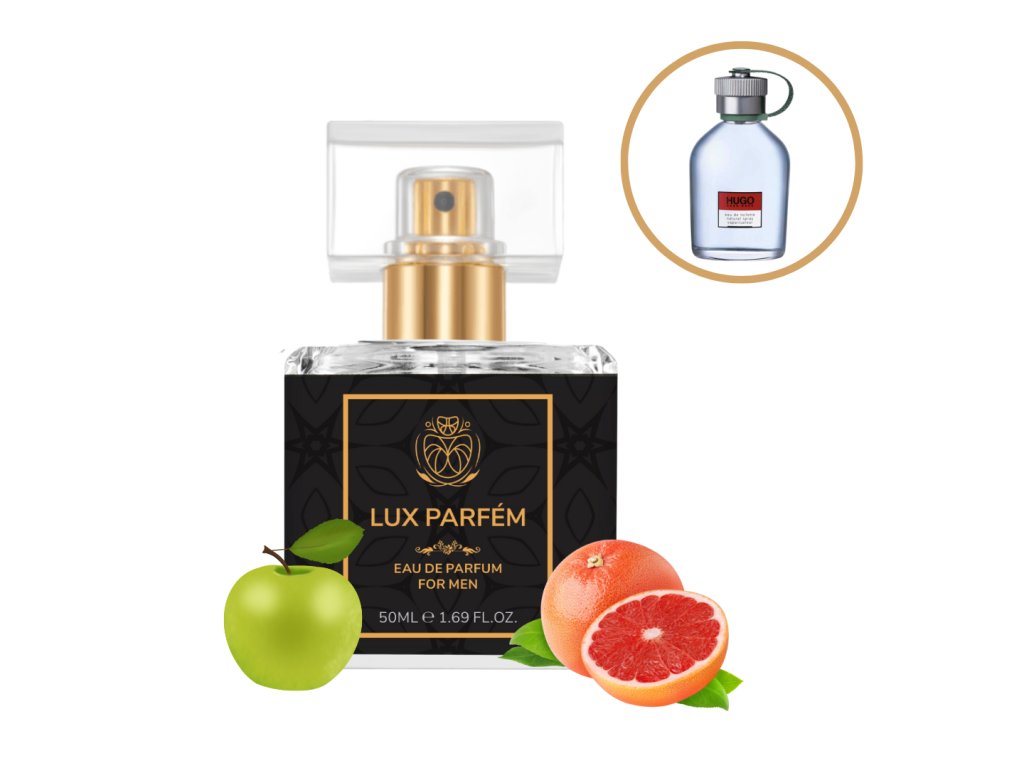 Náš parfém je inspirován aromaticko - zelenou vůní Hugo. Vrchní tóny jsou levandule, zelené jablko, máta, grapefruit a bazalka, střední tóny jsou karafiát, šalvěj, pelargonie a jasmín a základ tvoří jedle a cedr.