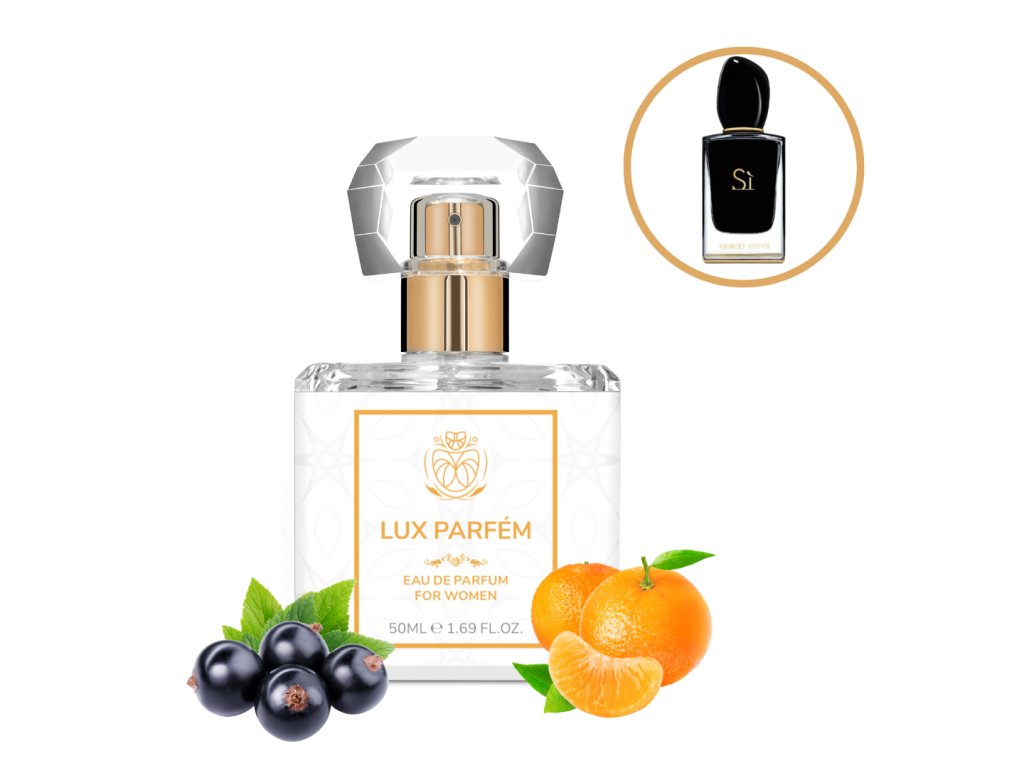 Náš parfém je inspirován chypre ovocnou vůní Sì Intense. Vrchní tóny jsou kasie, černý rybíz, mandarinka, bergamot a frézie, střední tóny jsou květnová růže, neroli, artemise a osmanthus a základ tvoří ambroxan, pačuli, dřevité tóny a vanilka.